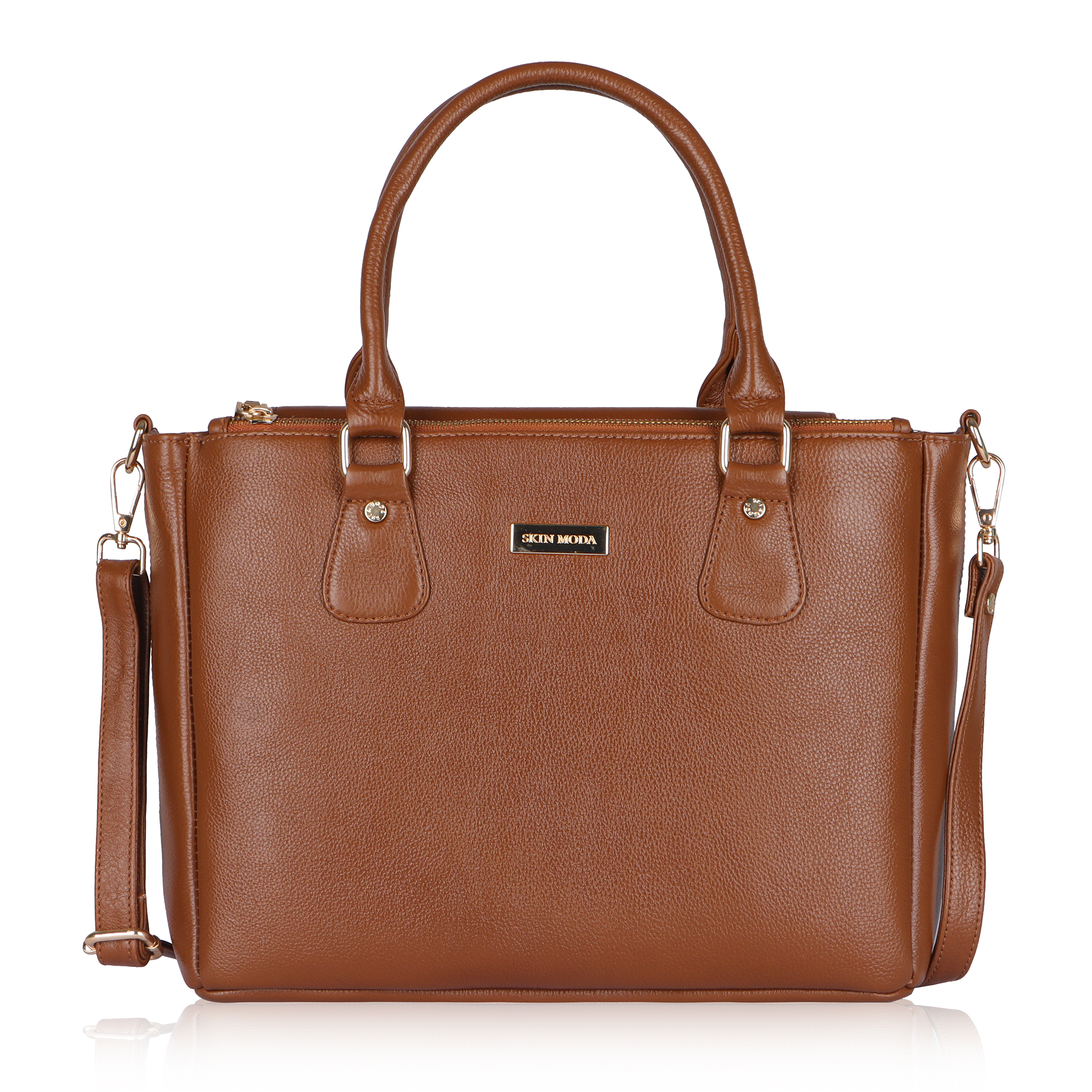 Elegant and durable, this SKIN MODA full-grain natural leather tote bag features 3 spacious main compartments, a secure back zipper pocket, an inside chain pocket for valuables, and smooth YKK metal zippers, perfect for everyday sophistication and organization.